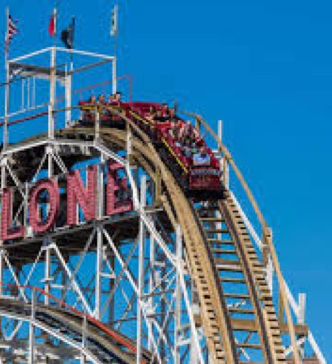 The cart is stopped at the top of the first hill