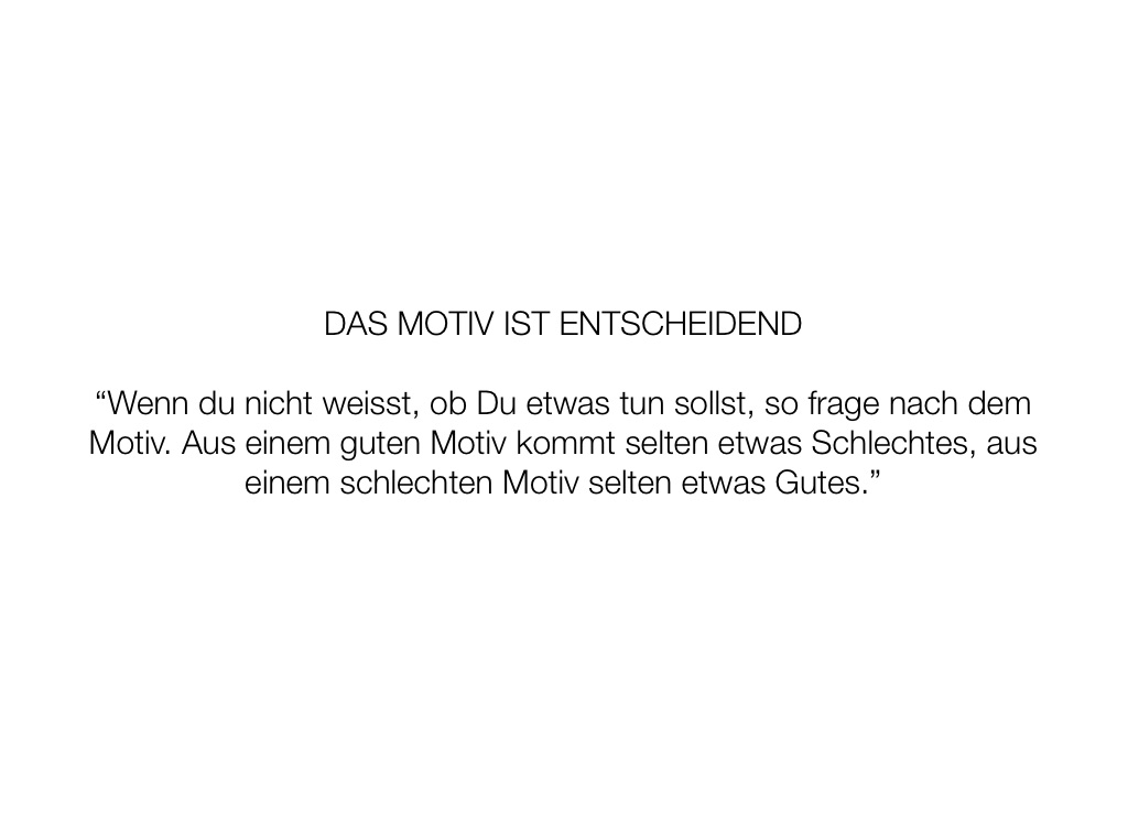 “Wenn du nicht weisst, ob Du etwas tun sollst, so frage nach dem Motiv. Aus einem guten Motiv kommt selten etwas Schlechtes, aus einem schlechten Motiv selten etwas Gutes.”