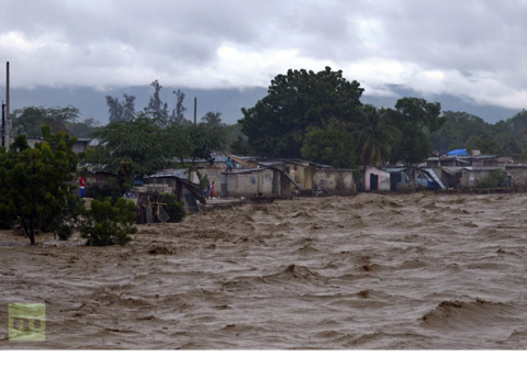Heavy rains from Hurricane Sandy causes the Croix de Mission river to swell to levels that threaten to flood the homes along its bank in Port-au-Prince October 25, 2012. (Reuters/Swoan Parker)
