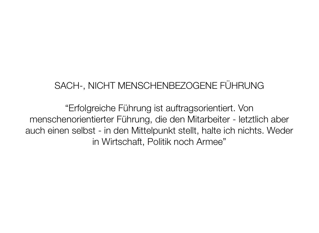 “Erfolgreiche Führung ist auftragsorientiert. Von menschenorientierter Führung, die den Mitarbeiter - letztlich aber auch einen selbst - in den Mittelpunkt stellt, halte ich nichts. Weder in Wirtschaft, Politik noch Armee”