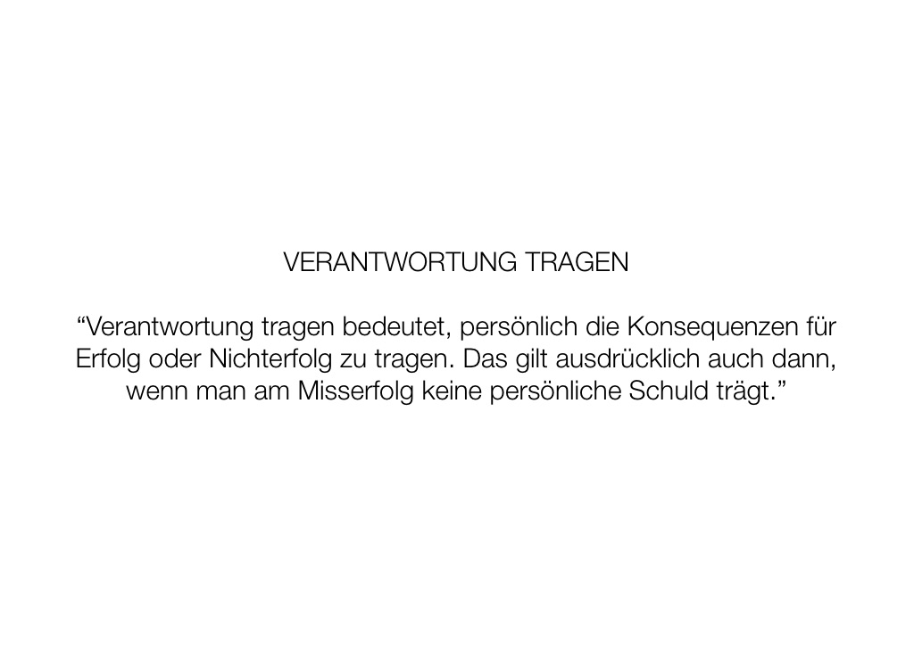 “Verantwortung tragen bedeutet, persönlich die Konsequenzen für Erfolg oder Nichterfolg zu tragen. Das gilt ausdrücklich auch dann, wenn man am Misserfolg keine persönliche Schuld trägt.”