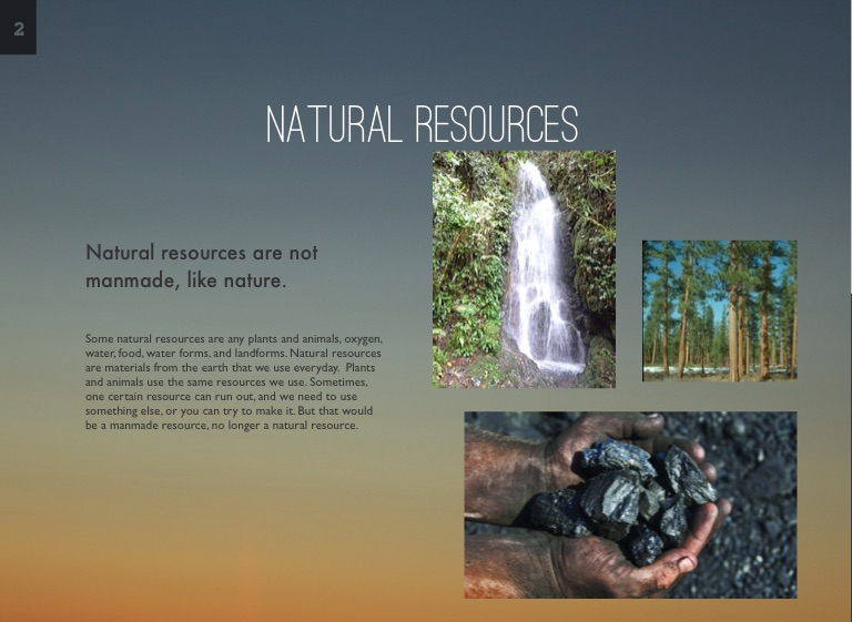 Some natural resources are any plants and animals, oxygen, water, food, water forms, and landforms. Natural resources are materials from the earth that we use everyday. Plants and animals use the same resources we use. Sometimes, one certain resource can run out, and we need to use something else, or you can try to make it. But that would be a manmade resource, no longer a natural resource.