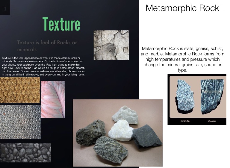 Texture is the feel, appearance or what it is made of from rocks or minerals. Textures are everywhere. On the bottom of your shoes, on your shoes, your backpack even the iPad I am using to make this right now. Texture on the iPad would be rough in some areas, smooth on other areas. Some common textures are sidewalks, phones, rocks in the ground like in driveways, and even your rug in your living room.