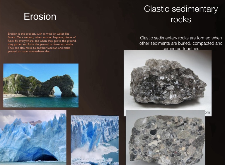 Erosion is the process, such as wind or water like floods. On a volcano, when erosion happens, pieces of Rock fly everywhere, and when they get to the ground, they gather and form the ground, or form into rocks. They can also move to another location and make ground, or rocks somewhere else.