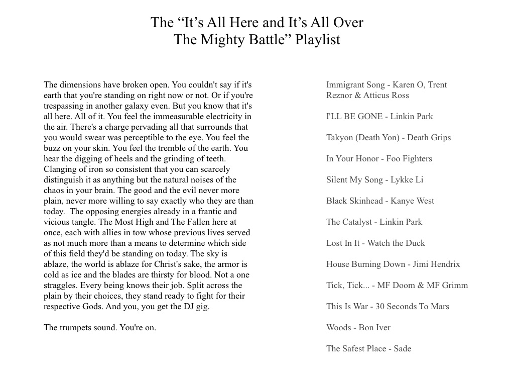 The dimensions have broken open. You couldn't say if it's earth that you're standing on right now or not. Or if you're trespassing in another galaxy even. But you know that it's all here. All of it. You feel the immeasurable electricity in the air. There's a charge pervading all that surrounds that you would swear was perceptible to the eye. You feel the buzz on your skin. You feel the tremble of the earth. You hear the digging of heels and the grinding of teeth. Clanging of iron so consistent that you can scarcely distinguish it as anything but the natural noises of the chaos in your brain. The good and the evil never more plain, never more willing to say exactly who they are than today. The opposing energies already in a frantic and vicious tangle. The Most High and The Fallen here at once, each with allies in tow whose previous lives served as not much more than a means to determine which side of this field they'd be standing on today. The sky is ablaze, the world is ablaze for Christ's sake, the armor is cold as ice and the blades are thirsty for blood. Not a one straggles. Every being knows their job. Split across the plain by their choices, they stand ready to fight for their respective Gods. And you, you get the DJ gig.