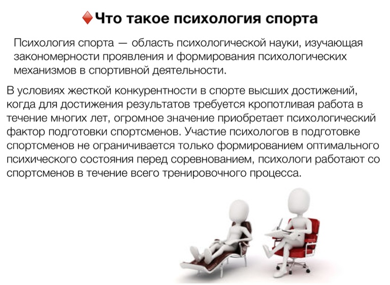 В условиях жесткой конкурентности в спорте высших достижений, когда для достижения результатов требуется кропотливая работа в течение многих лет, огромное значение приобретает психологический фактор подготовки спортсменов. Участие психологов в подготовке спортсменов не ограничивается только формированием оптимального психического состояния перед соревнованием, психологи работают со спортсменов в течение всего тренировочного процесса.