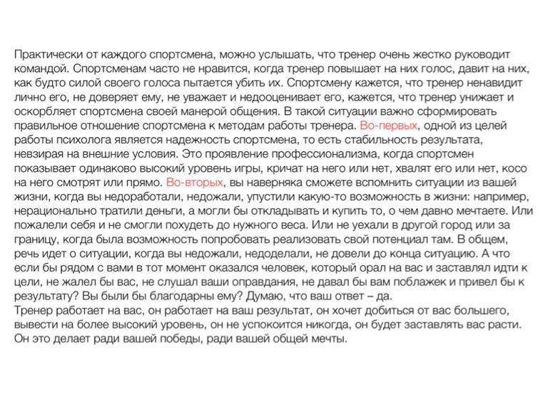 Практически от каждого спортсмена, можно услышать, что тренер очень жестко руководит командой. Спортсменам часто не нравится, когда тренер повышает на них голос, давит на них, как будто силой своего голоса пытается убить их. Спортсмену кажется, что тренер ненавидит лично его, не доверяет ему, не уважает и недооценивает его, кажется, что тренер унижает и оскорбляет спортсмена своей манерой общения. В такой ситуации важно сформировать правильное отношение спортсмена к методам работы тренера. Во-первых, одной из целей работы психолога является надежность спортсмена, то есть стабильность результата, невзирая на внешние условия. Это проявление профессионализма, когда спортсмен показывает одинаково высокий уровень игры, кричат на него или нет, хвалят его или нет, косо на него смотрят или прямо. Во-вторых, вы наверняка сможете вспомнить ситуации из вашей жизни, когда вы недоработали, недожали, упустили какую-то возможность в жизни: например, нерационально тратили деньги, а могли бы откладывать и купить то, о чем давно мечтаете. Или пожалели себя и не смогли похудеть до нужного веса. Или не уехали в другой город или за границу, когда была возможность попробовать реализовать свой потенциал там. В общем, речь идет о ситуации, когда вы недожали, недоделали, не довели до конца ситуацию. А что если бы рядом с вами в тот момент оказался человек, который орал на вас и заставлял идти к цели, не жалел бы вас, не слушал ваши оправдания, не давал бы вам поблажек и привел бы к результату? Вы были бы благодарны ему? Думаю, что ваш ответ – да.