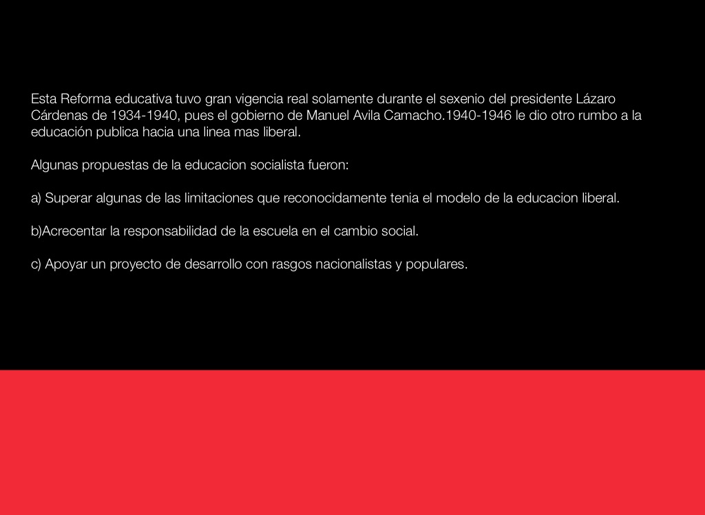 Esta Reforma educativa tuvo gran vigencia real solamente durante el sexenio del presidente Lázaro Cárdenas de 1934-1940, pues el gobierno de Manuel Avila Camacho.1940-1946 le dio otro rumbo a la educación publica hacia una linea mas liberal.