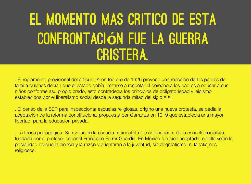 . El reglamento provisional del articulo 3º en febrero de 1926 provoco una reacción de los padres de familia quienes decían que el estado debía limitarse a respetar el derecho a los padres a educar a sus niños conforme asu propio credo, esto contradecía los principios de obligatoriedad y laicismo establecidos por el liberalismo social desde la segunda mitad del siglo XIX.