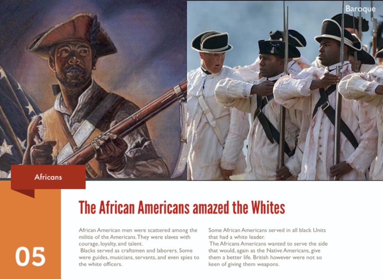 African American men were scattered among the militia of the Americans. They were slaves with courage, loyalty, and talent.