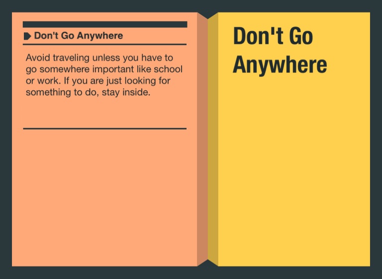 Avoid traveling unless you have to go somewhere important like school or work. If you are just looking for something to do, stay inside.