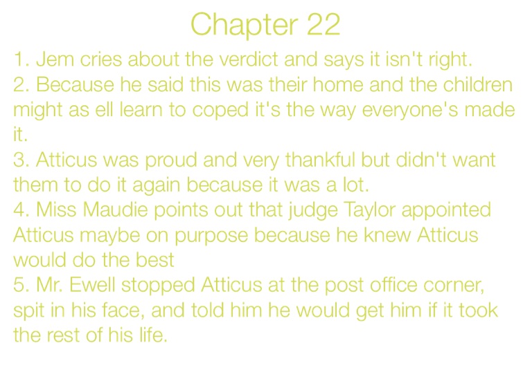 5. Mr. Ewell stopped Atticus at the post office corner, spit in his face, and told him he would get him if it took the rest of his life.