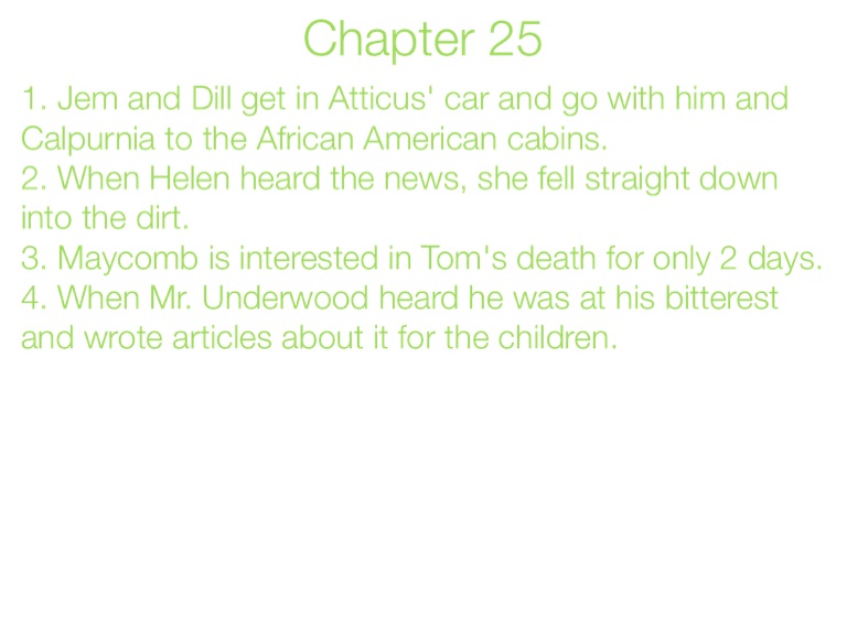 1. Jem and Dill get in Atticus' car and go with him and Calpurnia to the African American cabins.