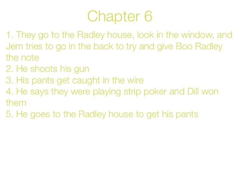 1. They go to the Radley house, look in the window, and Jem tries to go in the back to try and give Boo Radley the note