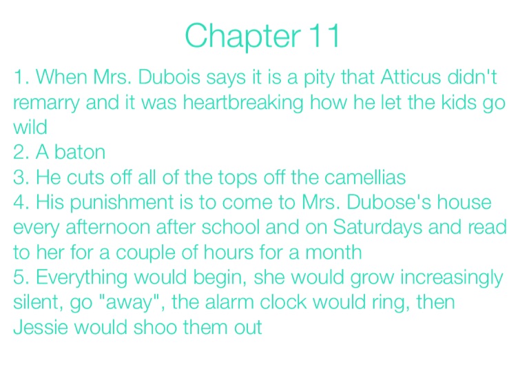 1. When Mrs. Dubois says it is a pity that Atticus didn't remarry and it was heartbreaking how he let the kids go wild