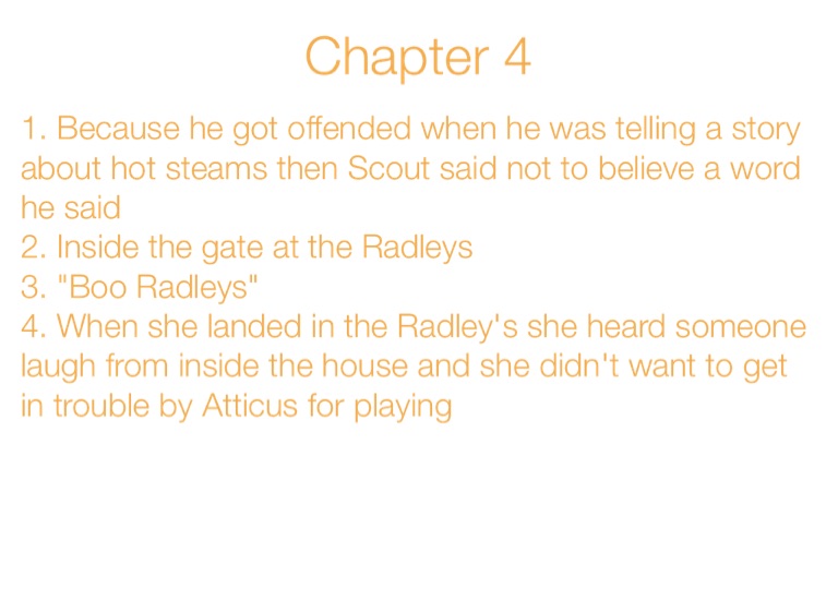 4. When she landed in the Radley's she heard someone laugh from inside the house and she didn't want to get in trouble by Atticus for playing