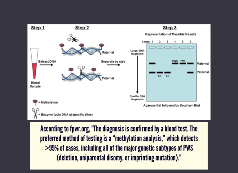 According to fpwr.org, "The diagnosis is confirmed by a blood test. The preferred method of testing is a “methylation analysis,” which detects >99% of cases, including all of the major genetic subtypes of PWS (deletion, uniparental disomy, or imprinting mutation)."