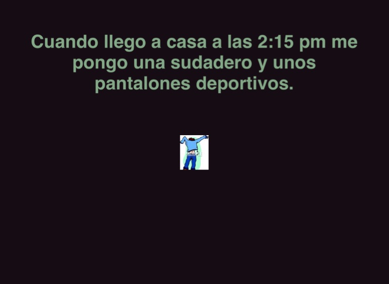 Cuando llego a casa a las 2:15 pm me pongo una sudadero y unos pantalones deportivos.