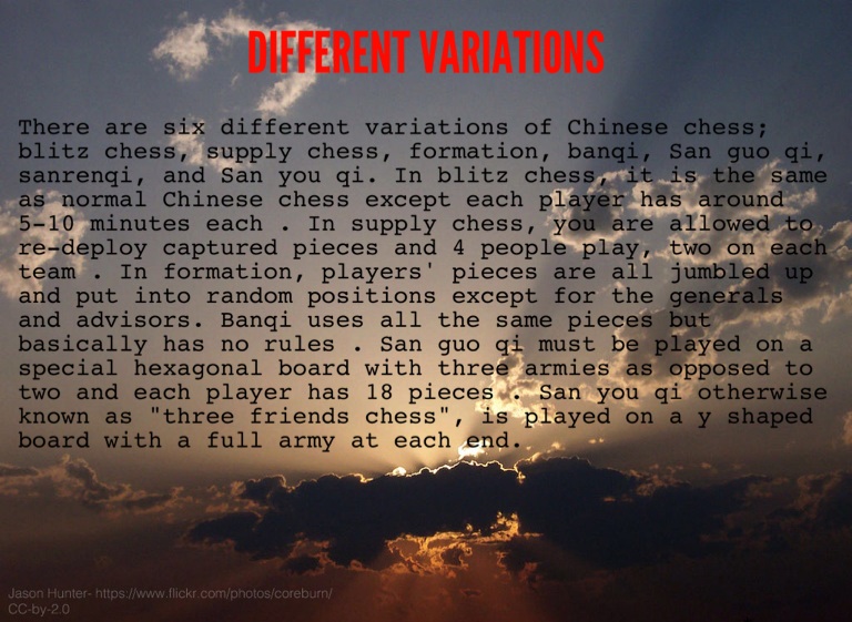 There are six different variations of Chinese chess; blitz chess, supply chess, formation, banqi, San guo qi, sanrenqi, and San you qi. In blitz chess, it is the same as normal Chinese chess except each player has around 5-10 minutes each . In supply chess, you are allowed to re-deploy captured pieces and 4 people play, two on each team . In formation, players' pieces are all jumbled up and put into random positions except for the generals and advisors. Banqi uses all the same pieces but basically has no rules . San guo qi must be played on a special hexagonal board with three armies as opposed to two and each player has 18 pieces . San you qi otherwise known as "three friends chess", is played on a y shaped board with a full army at each end.