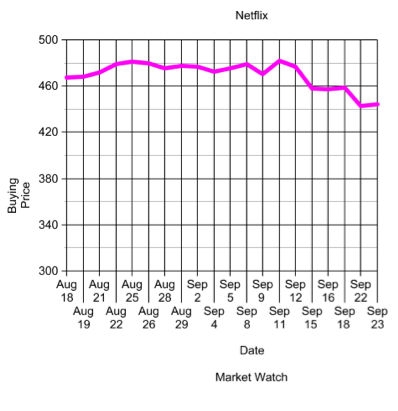 On August 18th of 2014 I purchased Netflix (NFLX). I bought 58 shares of Netflix at a cost of $467.67 each share. I then sold several shares at a selling price of $467.72 which left me at a loss of $10.16. I decided to buy and keep Netflix because many people purchase from the streaming media company and I thought that it would thrive. Netflix is a video rental and streaming website that allows people to watch unlimited tv shows and movies at a very low cost per month.On August 28th I sold 28 shares of Netflix at a selling price of $476.86 and made profit of $9.14 a share. Near the end of the Stock Market game, Netflix disappointed me in their performance, leaving me in a lower ranking.