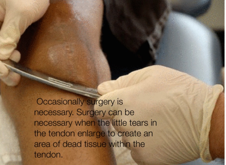 Occasionally surgery is necessary. Surgery can be necessary when the little tears in the tendon enlarge to create an area of dead tissue within the tendon.