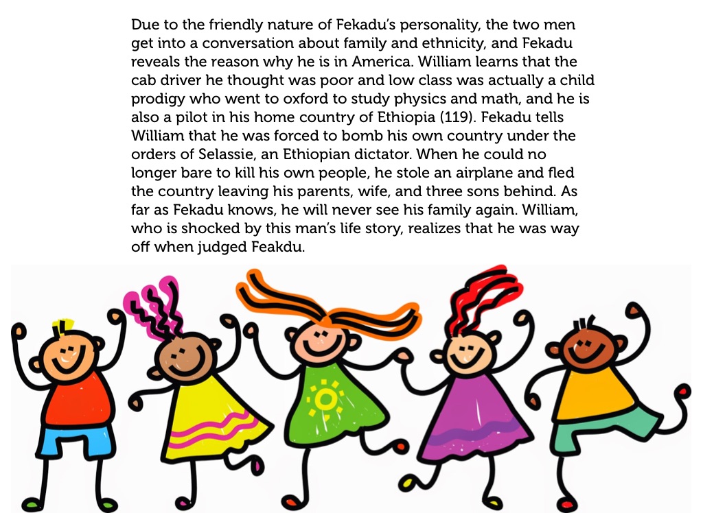 Due to the friendly nature of Fekadu’s personality, the two men get into a conversation about family and ethnicity, and Fekadu reveals the reason why he is in America. William learns that the cab driver he thought was poor and low class was actually a child prodigy who went to oxford to study physics and math, and he is also a pilot in his home country of Ethiopia (119). Fekadu tells William that he was forced to bomb his own country under the orders of Selassie, an Ethiopian dictator. When he could no longer bare to kill his own people, he stole an airplane and fled the country leaving his parents, wife, and three sons behind. As far as Fekadu knows, he will never see his family again. William, who is shocked by this man’s life story, realizes that he was way off when judged Feakdu.