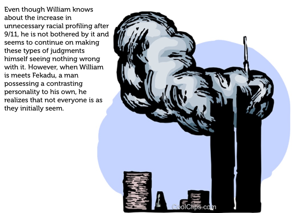 Even though William knows about the increase in unnecessary racial profiling after 9/11, he is not bothered by it and seems to continue on making these types of judgments himself seeing nothing wrong with it. However, when William is meets Fekadu, a man possessing a contrasting personality to his own, he realizes that not everyone is as they initially seem.