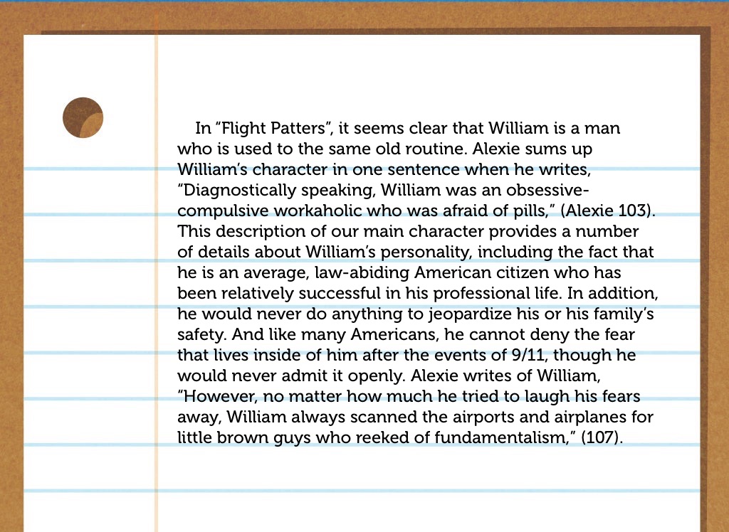 In “Flight Patters”, it seems clear that William is a man who is used to the same old routine. Alexie sums up William’s character in one sentence when he writes, “Diagnostically speaking, William was an obsessive-compulsive workaholic who was afraid of pills,” (Alexie 103). This description of our main character provides a number of details about William’s personality, including the fact that he is an average, law-abiding American citizen who has been relatively successful in his professional life. In addition, he would never do anything to jeopardize his or his family’s safety. And like many Americans, he cannot deny the fear that lives inside of him after the events of 9/11, though he would never admit it openly. Alexie writes of William, “However, no matter how much he tried to laugh his fears away, William always scanned the airports and airplanes for little brown guys who reeked of fundamentalism,” (107).