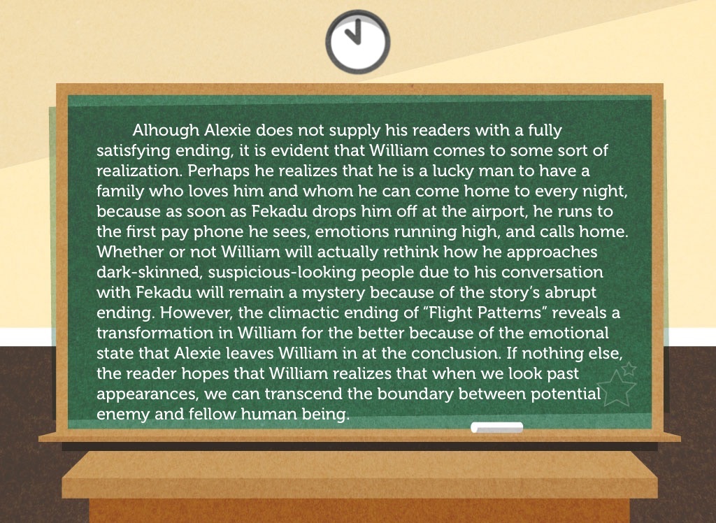Alhough Alexie does not supply his readers with a fully satisfying ending, it is evident that William comes to some sort of realization. Perhaps he realizes that he is a lucky man to have a family who loves him and whom he can come home to every night, because as soon as Fekadu drops him off at the airport, he runs to the first pay phone he sees, emotions running high, and calls home. Whether or not William will actually rethink how he approaches dark-skinned, suspicious-looking people due to his conversation with Fekadu will remain a mystery because of the story’s abrupt ending. However, the climactic ending of “Flight Patterns” reveals a transformation in William for the better because of the emotional state that Alexie leaves William in at the conclusion. If nothing else, the reader hopes that William realizes that when we look past appearances, we can transcend the boundary between potential enemy and fellow human being.