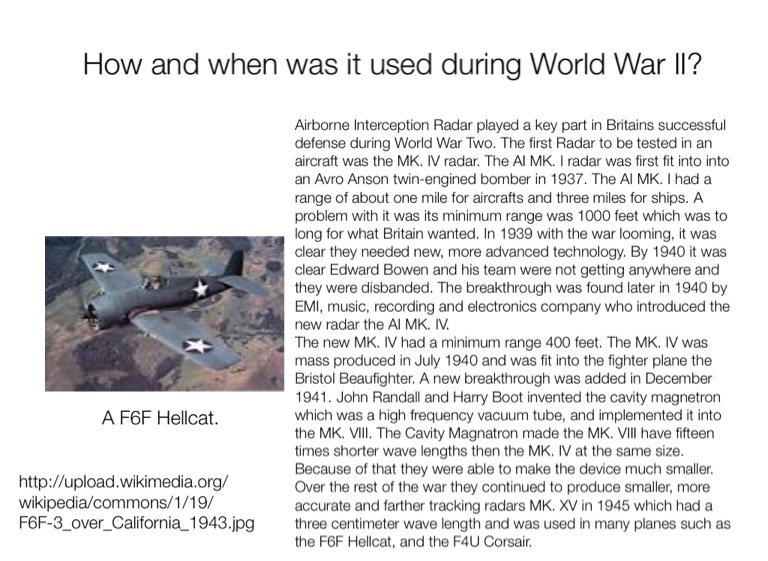 The new MK. IV had a minimum range 400 feet. The MK. IV was mass produced in July 1940 and was fit into the fighter plane the Bristol Beaufighter. A new breakthrough was added in December 1941. John Randall and Harry Boot invented the cavity magnetron which was a high frequency vacuum tube, and implemented it into the MK. VIII. The Cavity Magnatron made the MK. VIII have fifteen times shorter wave lengths then the MK. IV at the same size. Because of that they were able to make the device much smaller. Over the rest of the war they continued to produce smaller, more accurate and farther tracking radars MK. XV in 1945 which had a three centimeter wave length and was used in many planes such as the F6F Hellcat, and the F4U Corsair.