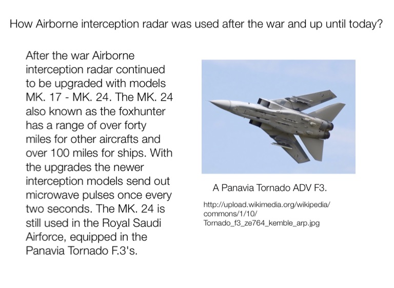After the war Airborne interception radar continued to be upgraded with models MK. 17 - MK. 24. The MK. 24 also known as the foxhunter has a range of over forty miles for other aircrafts and over 100 miles for ships. With the upgrades the newer interception models send out microwave pulses once every two seconds. The MK. 24 is still used in the Royal Saudi Airforce, equipped in the Panavia Tornado F.3's.