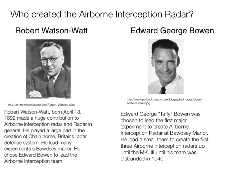 Robert Watson-Watt, born April 13, 1892 made a huge contribution to Airborne interception radar and Radar in general. He played a large part in the creation of Chain home, Britains radar defense system. He lead many experiments s Bawdsey manor. He chose Edward Bowen to lead the Airborne Interception team.