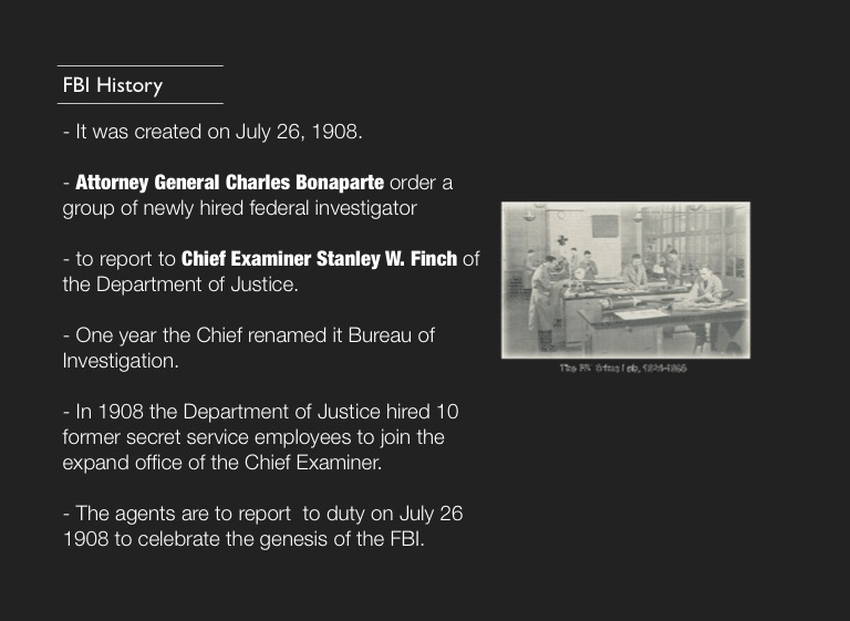 - Attorney General Charles Bonaparte order a group of newly hired federal investigator
