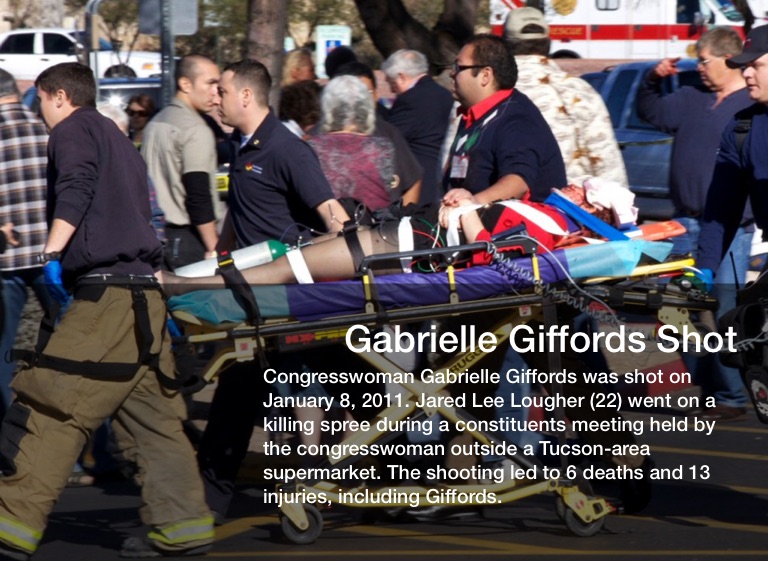 Congresswoman Gabrielle Giffords was shot on January 8, 2011. Jared Lee Lougher (22) went on a killing spree during a constituents meeting held by the congresswoman outside a Tucson-area supermarket. The shooting led to 6 deaths and 13 injuries, including Giffords.