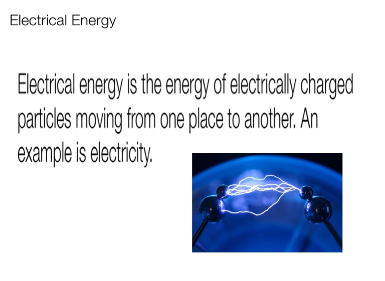 Electrical energy is the energy of electrically charged particles moving from one place to another. An example is electricity.
