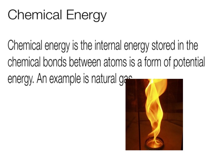 Chemical energy is the internal energy stored in the chemical bonds between atoms is a form of potential energy. An example is natural gas.
