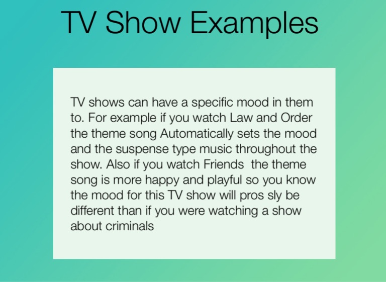 TV shows can have a specific mood in them to. For example if you watch Law and Order the theme song Automatically sets the mood and the suspense type music throughout the show. Also if you watch Friends the theme song is more happy and playful so you know the mood for this TV show will pros sly be different than if you were watching a show about criminals