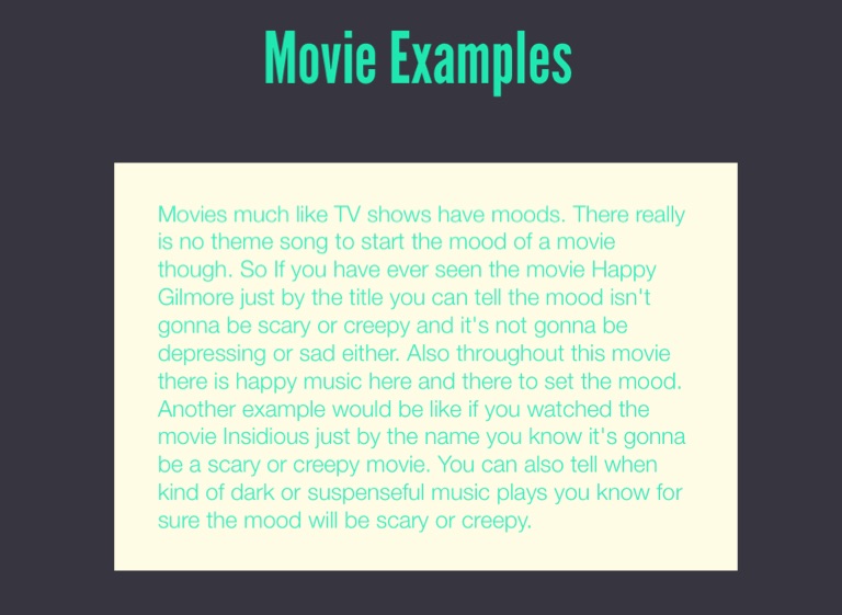 Movies much like TV shows have moods. There really is no theme song to start the mood of a movie though. So If you have ever seen the movie Happy Gilmore just by the title you can tell the mood isn't gonna be scary or creepy and it's not gonna be depressing or sad either. Also throughout this movie there is happy music here and there to set the mood. Another example would be like if you watched the movie Insidious just by the name you know it's gonna be a scary or creepy movie. You can also tell when kind of dark or suspenseful music plays you know for sure the mood will be scary or creepy.