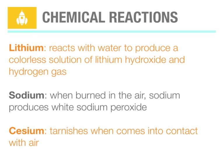 Lithium: reacts with water to produce a colorless solution of lithium hydroxide and hydrogen gas
