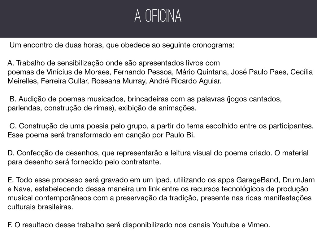 C. Construção de uma poesia pelo grupo, a partir do tema escolhido entre os participantes. Esse poema será transformado em canção por Paulo Bi.