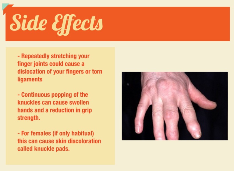 - Continuous popping of the knuckles can cause swollen hands and a reduction in grip strength.