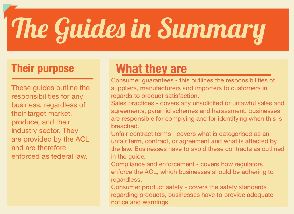 These guides outline the responsibilities for any business, regardless of their target market, produce, and their industry sector. They are provided by the ACL and are therefore enforced as federal law.