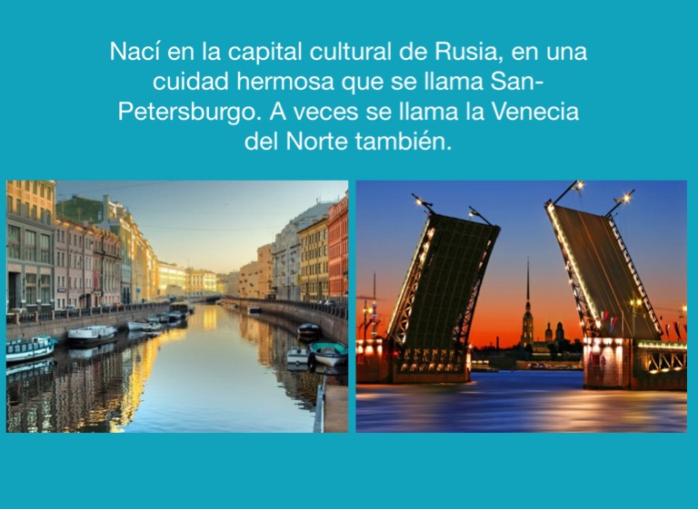 Nací en la capital cultural de Rusia, en una cuidad hermosa que se llama San-Petersburgo. A veces se llama la Venecia del Norte también.