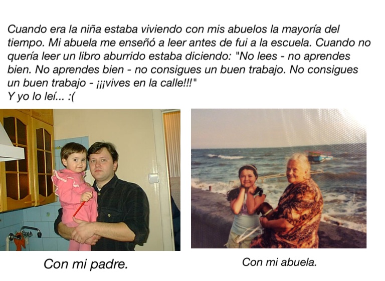 Cuando era la niña estaba viviendo con mis abuelos la mayoría del tiempo. Mi abuela me enseñó a leer antes de fui a la escuela. Cuando no quería leer un libro aburrido estaba diciendo: "No lees - no aprendes bien. No aprendes bien - no consigues un buen trabajo. No consigues un buen trabajo - ¡¡¡vives en la calle!!!"