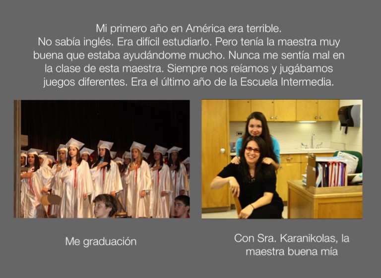 No sabía inglés. Era difícil estudiarlo. Pero tenía la maestra muy buena que estaba ayudándome mucho. Nunca me sentía mal en la clase de esta maestra. Siempre nos reíamos y jugábamos juegos diferentes. Era el último año de la Escuela Intermedia.
