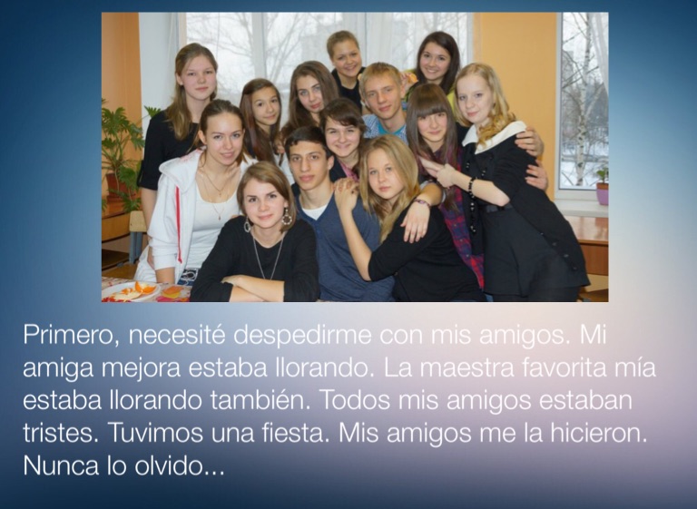 Primero, necesité despedirme con mis amigos. Mi amiga mejora estaba llorando. La maestra favorita mía estaba llorando también. Todos mis amigos estaban tristes. Tuvimos una fiesta. Mis amigos me la hicieron.