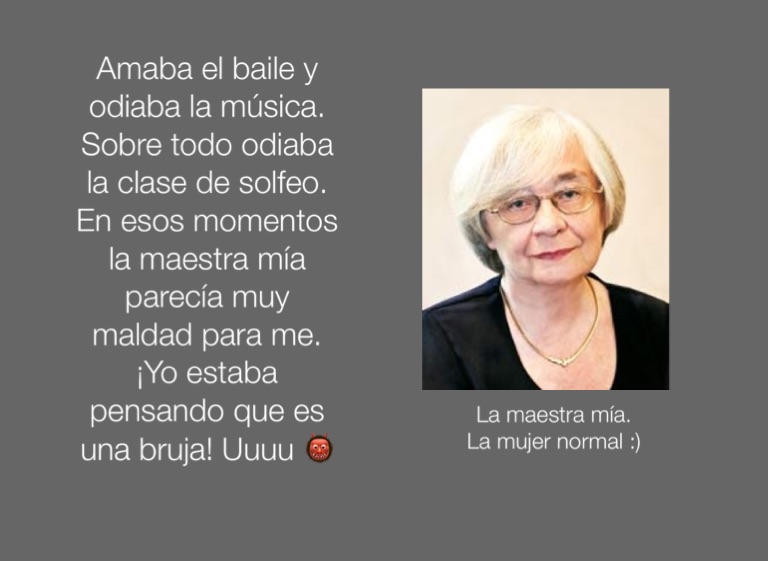 Amaba el baile y odiaba la música. Sobre todo odiaba la clase de solfeo. En esos momentos la maestra mía parecía muy maldad para me. ¡Yo estaba pensando que es una bruja! Uuuu 👹