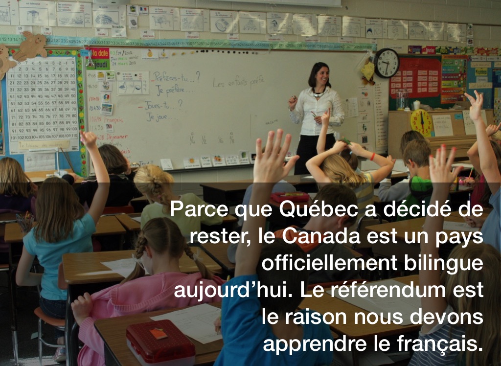 Parce que Québec a décidé de rester, le Canada est un pays officiellement bilingue aujourd’hui. Le référendum est le raison nous devons apprendre le français.