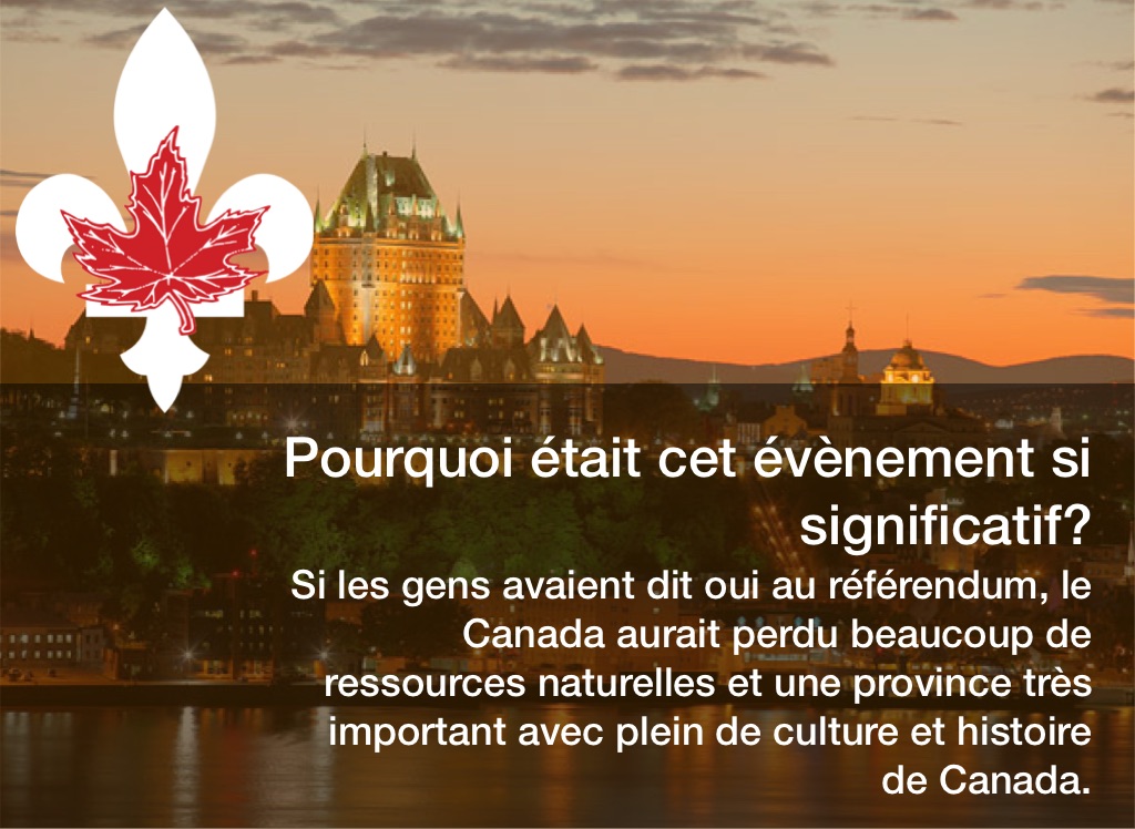 Si les gens avaient dit oui au référendum, le Canada aurait perdu beaucoup de ressources naturelles et une province très important avec plein de culture et histoire de Canada.