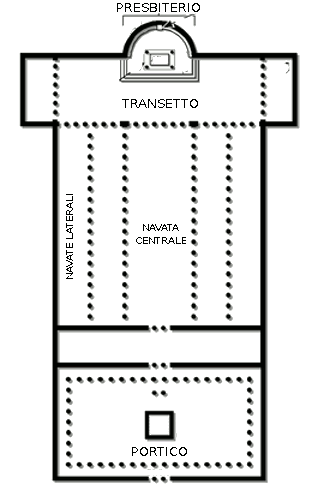 Navata: nelle basiliche e lo spazio centrale, compreso tra due file di colonne, oppure tra una fila di colonne e un muro perimetrale.